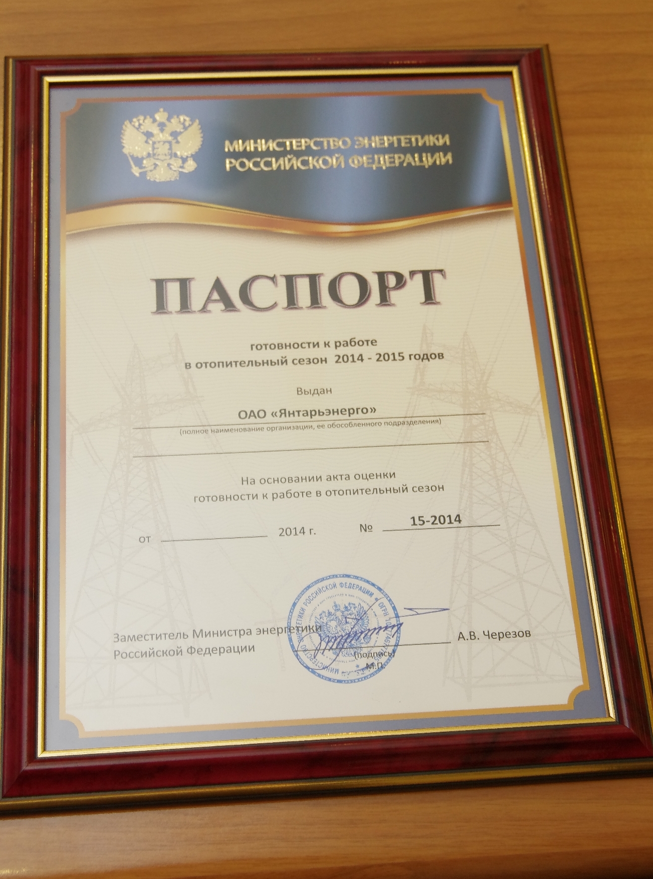 Акт готовности ОАО «Янтарьэнерго» к работе в осенне-зимний период (ОЗП) 2014-2015 годов подписан без замечаний. Подведены итоги проверки предприятия комиссией, назначенной Министерством энергетики РФ. Ее председатель, заместитель начальника Управления государственного энергетического надзора Ростехнадзора Александр Антюхов вручил главе компании Игорю Маковскому паспорт готовности с подписью заместителя министра энергетики РФ Андрея Черезова. Он сказал: «Мы оценили положительную динамику по уменьшению аварийности в «Янтарьэнерго». Для обеспечения надежного электроснабжения Калининградской области сделано очень много. Желаем вам безаварийной работы в отопительном периоде!»